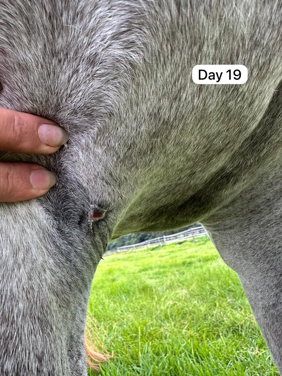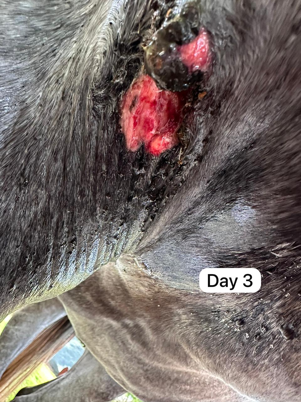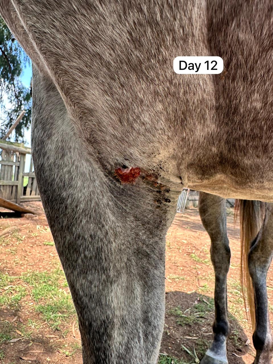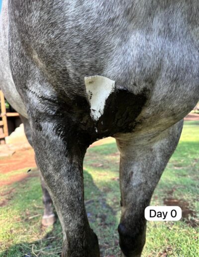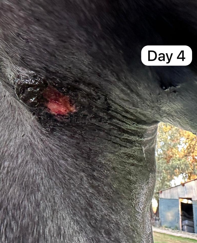 It’s called MAGIC MUD for a reason! Check this out! One of my geldings got himself impaled during the night and, yes, I stuck my finger in it to check for objects.
