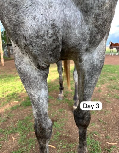 I applied the Mud 3 x per day for the first two or three days, thereafter, simmering down to twice per day, then once per day. After only TWO WEEKS the wound had closed up, swelling had disappeared and he was completely sound with only a tiny scab as evidence that there was ever an open wound!
